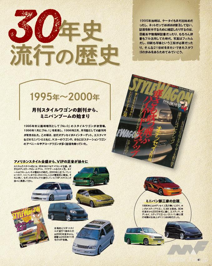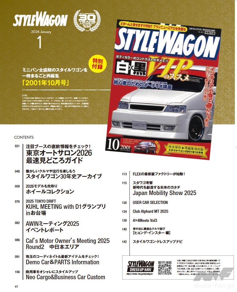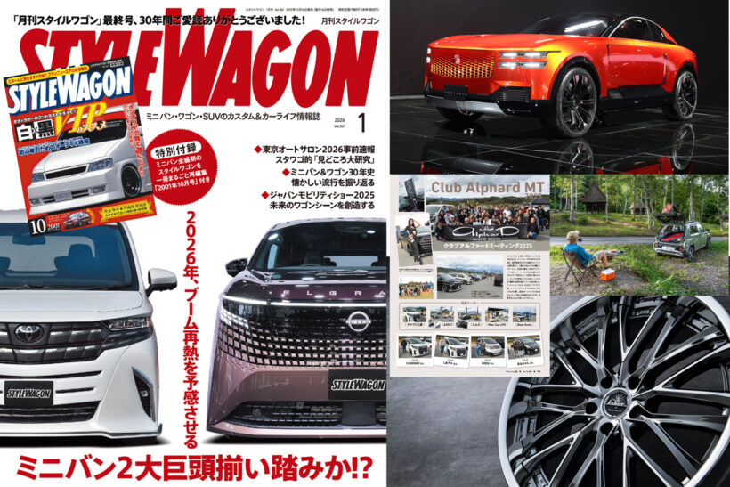 カスタム 当時の内容を再編集した特別付録も! 12月16日発売の『スタイルワゴン2026年1月号』は、カスタムの歴史を紐解く永久保存版!!【写真・9枚目】 2026モデルをいち早く発表したホイールメーカーの新製品をクローズアップ。来年のトレンドも見えてくるのでしっかりとチェックしておこう。 イベントレポートやオフ会など、ユーザーカー情報も掲載中。他の人のこだわりカスタムを見て、愛車の参考にしてみよう。 今月号の「車中泊に最適なクルマ選び」では、ヒョンデのインスターを紹介。ヒョンデのラインアップの中で最もなコンパクトなクルマでどんな車中泊ができるのか? 魅力的なクルマが多数展示されたジャパンモビリティショー2025をスタワゴ的な目線でチェック。これから登場する話題の新型車の解説や、今後のカスタムのアイデアになるようなポイントを探してみよう。 スタイルワゴンが月刊誌として伝えてきた30年間をギュギュッと凝縮。流行やカーライフスタイルがどんどんと変わってきたその時代の流れを感じてみよう。懐かしのスタイルやパーツもあり。 この画像の記事を読む