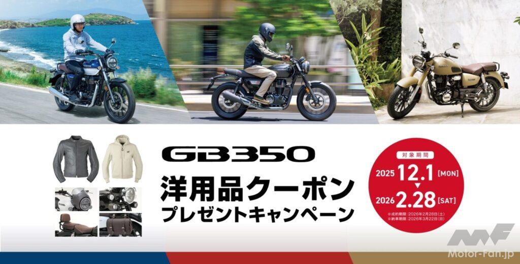 2025年12月1日から2026年2月28日まで、GB350シリーズの新車成約者を対象とした洋用品クーポンキャンペーンが行われている。対象はすべて2025年モデルで、GB350、GB350 S、GB350 Cが含まれる。クーポンはHondaGO BIKE GEARに掲載される洋用品に利用でき、金額は55,000円(税込)である。工賃には使用できず、取付工賃は利用者負担となる。クーポン利用期限は2026年2月28日である。