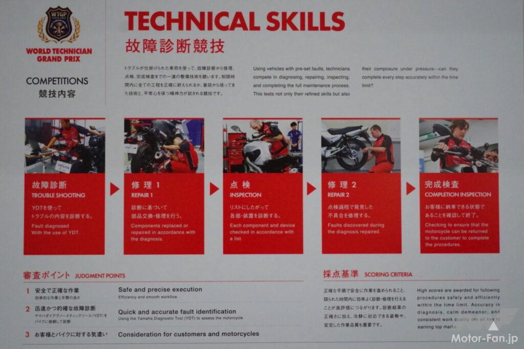 ヤマハ「World Technician Grand Prix 2025」は、世界各国のYTA認定整備士が集い、メカニック(整備士)の最高峰を決めるこの大会です。大きく分けて「故障診断」と「お客様対応」の2つの”競技”で構成されていて、修理対応の総合力を競います。限られた時間内に故障の真因を特定し修復する”技術力”と、来店したお客様への分かりやすい説明で信頼を築く”対応力”を評価する。競技は実走想定の課題で構成され、採点は手順遵守、正確性、説明力、公平性に加え、安全意識と倫理観も重視し、厳格な世界水準の審査が行われる。