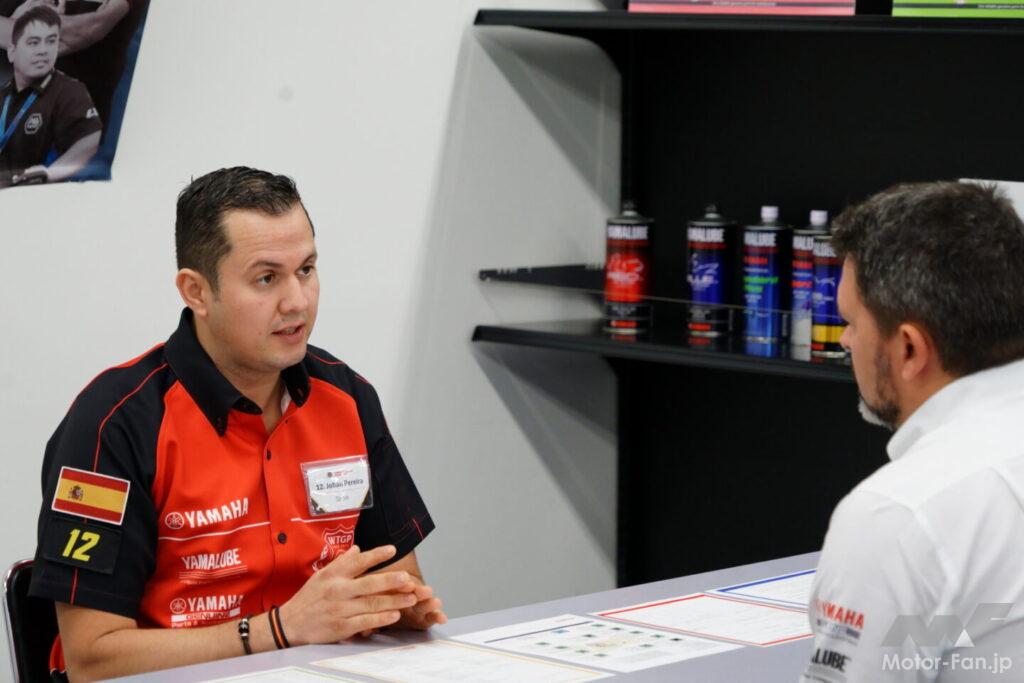 競技は、バイクのメンテナンスを依頼したお客様を店内で納得行くように接客することを想定して行われます。お客様役を務めるのは、そのメカニックの所属する販売店と関係のある地域のヤマハインポーターの担当者などが多いとのこと。言葉がちゃんと通じて、顔見知りのため、要らぬ緊張をすることもないというわけです。