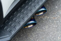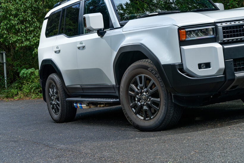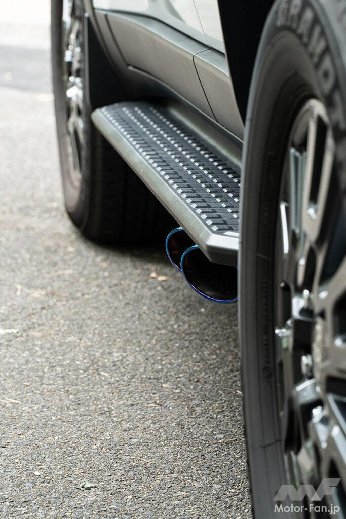 ノブレッセがLC250に贈るのは車検対応のマフラー。スタイリッシュなオーバルテールを左右4本、しかもサイド出し仕様だ。存在感高まる左右4本サイド出しは、今4×4で注目のスタイル。テールはステンレスとチタンカラーの2色を設定。さらに、ドレスアップ目線に定評のあるノブレッセらしく、無段階のテールスライド機構を採用。ステップとツラウチから、ちょいハミ出しまで好みに合わせて、テールの出幅が調整できる。タイコから新設計しセンサー取り付け部も純正に忠実。気になるサウンドは純正同等なので、ジェントルにスタイルアップできる。高品質ならではの満足度と、ビジュアルの変わった感を強く味わえるマフラーとなっている。