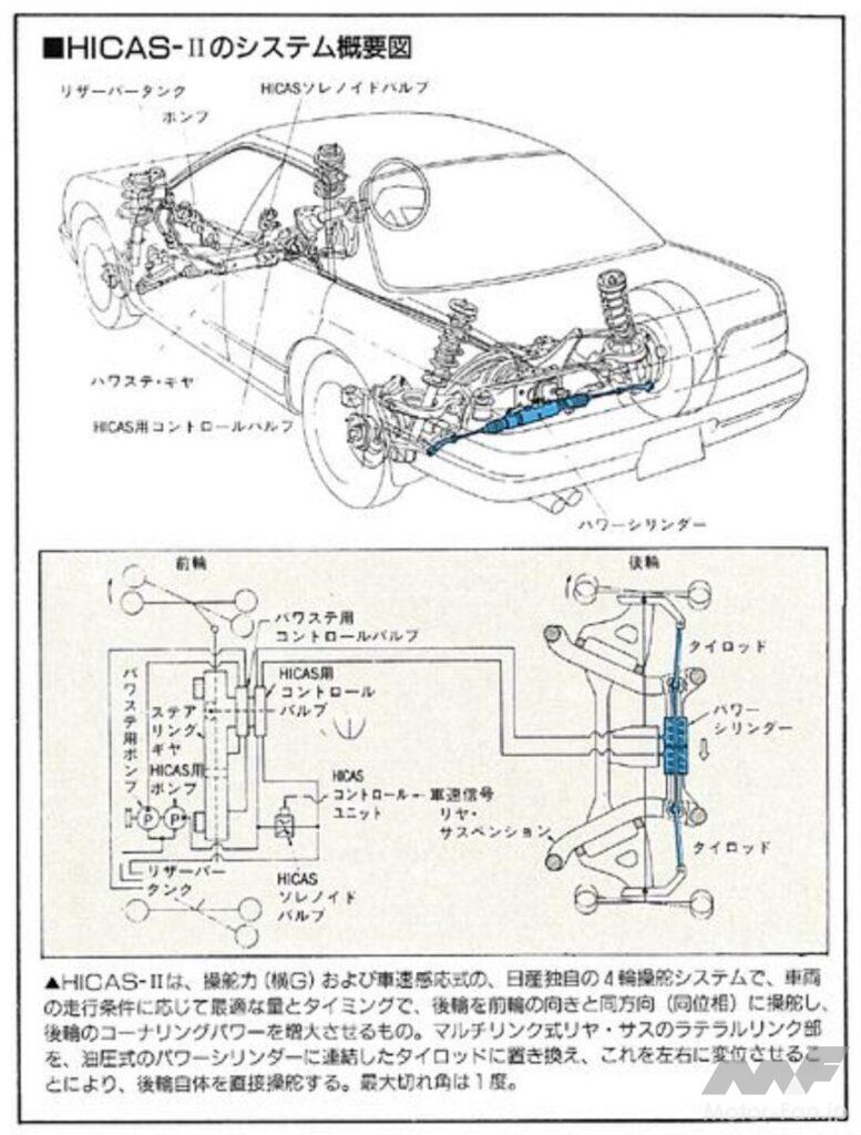 足回りはフロントがストラット式、リアはマルチリンク式で操縦安定性と乗り心地を高次元で両立させた。また、上級グレードには、新世代の4輪操舵“HICAS-II”、路面状況や運転に合わせてダンパーの硬さやステアリングの操舵力を制御する“DUET-SS”が採用された。