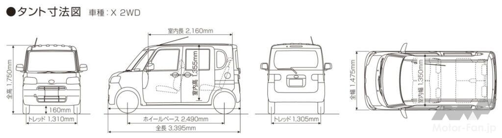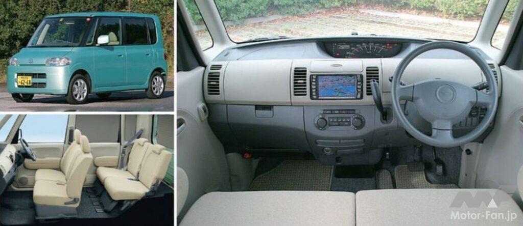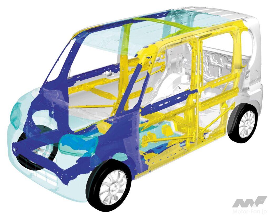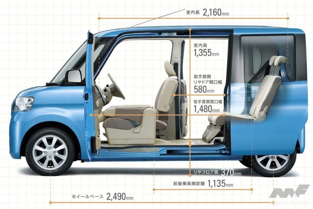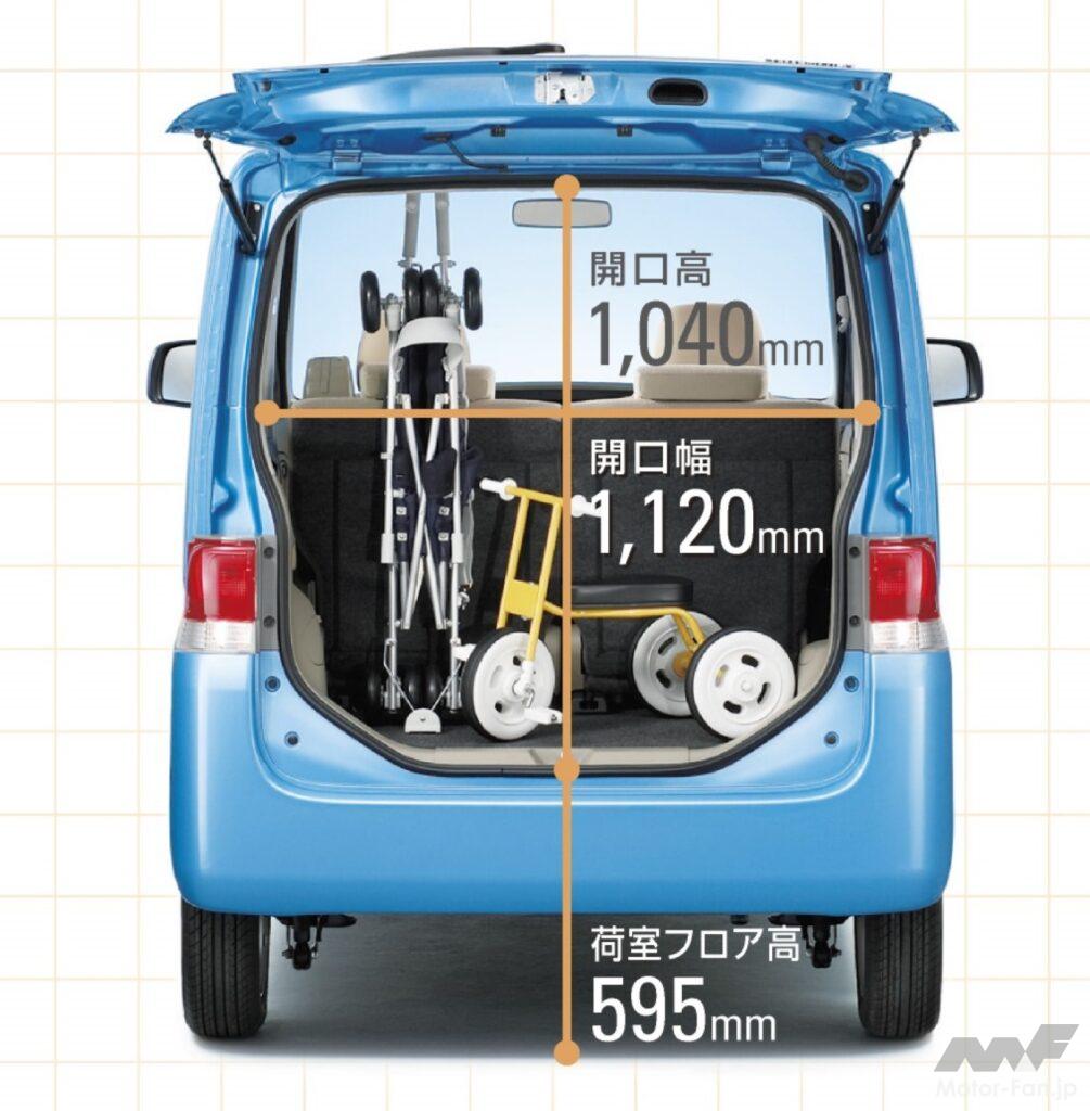 ボディサイズは、標準グレードで全長3395mm×全幅1475mm×全高1725mm(ムーヴより105mm高い)、またホイールベースは軽最大の2440mmにして、フラットで圧倒的な室内スペースを達成。ボディ骨格には、進化版衝突安全ボディ“TAF”を採用し、左右分轄でロングスライドできるリクライニングの格納機構付きリアシート、大きな開口部のリアゲートなどで利便性が高められた。