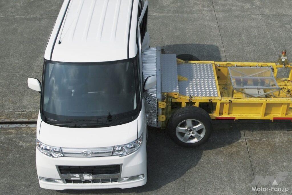 その結果、タントはNASVA(自動車事故対策機構)の側突試験で、最高ランクのレベル5を獲得し、ピラーレスでも衝突安全性に問題ないことが実証されている。ちなみに側突試験とは、試験車(タント)のピラーレス側に90度方向から1.3トンの台車を時速55km/hで衝突させて、助手席のダミー(人形)の被害状況から乗員保護性能を評価する方法である。