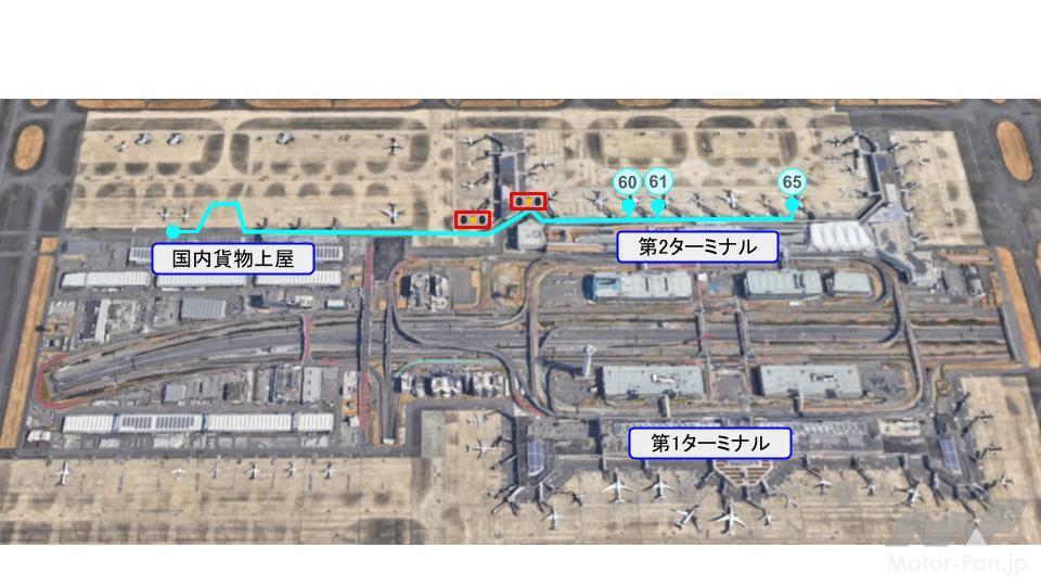 | 自動運転コース | ・第2ターミナル60・61・65番スポット〜東貨物上屋間(片道 約1.5km) ・走行経路上に2ヶ所の信号機があり、自動運転車両が従道路から主道路へ合流する際に手動運転車両へ一時停止を促す (下図、赤枠位置) |