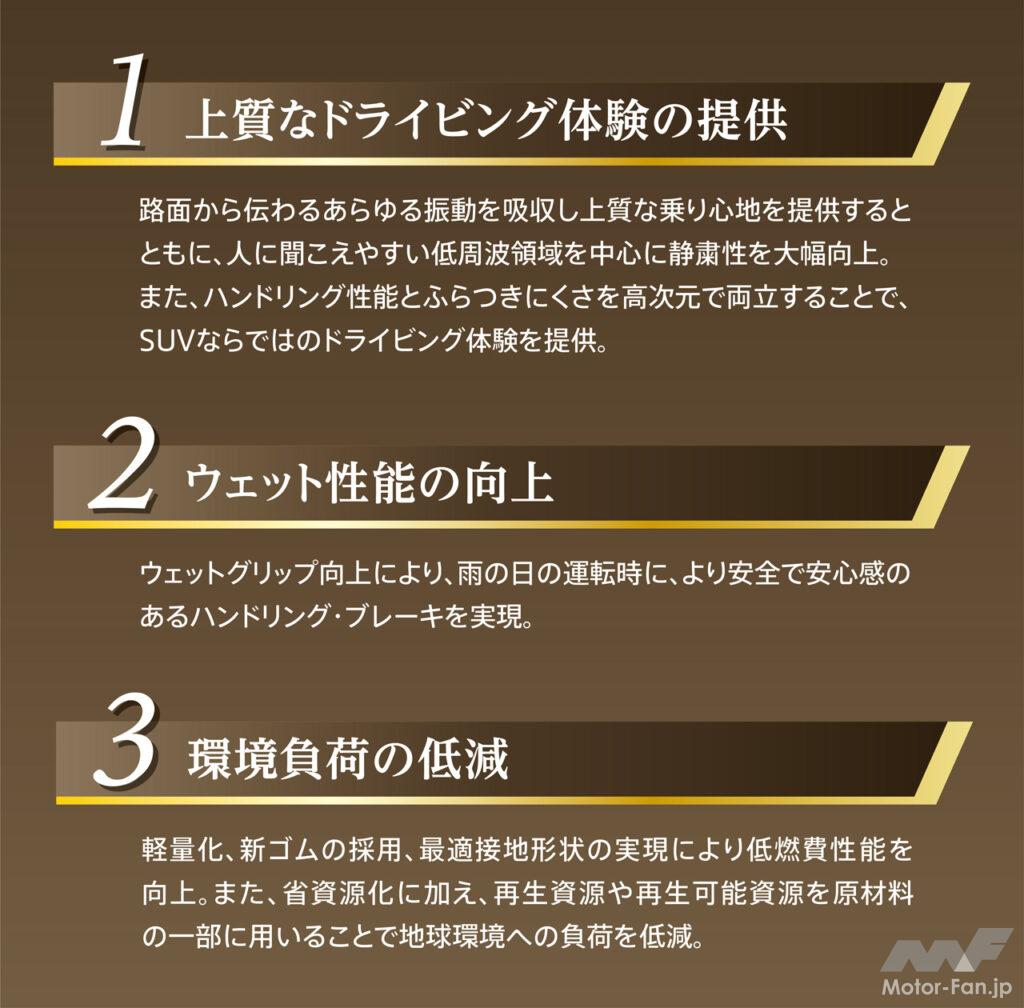 構造・形状の最適化と新パタンにより、乗り心地・運動性能・静粛性を高次元に向上させ、プレミアムSUVにふさわしい「静かでなめらかな走り」を提供する。