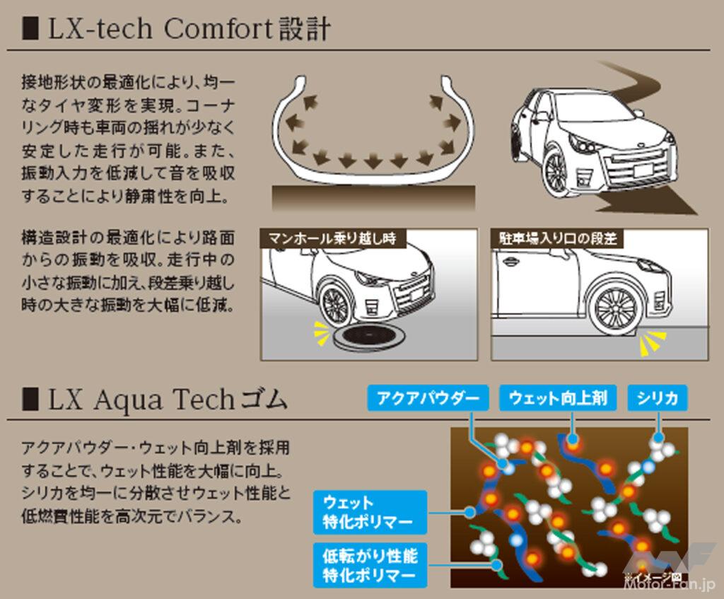 「アクアパウダー※」とウエット向上剤を採用した「LX Aqua Techゴム」により、ウエット性能を大幅に向上させ、雨の日の運転時に、より安全で安心感のあるハンドリング・ブレーキ性能を実現。ウエットブレーキ制動距離は従来品対比で15%短縮。ウエットグリップ性能は全サイズaグレードを達成している。