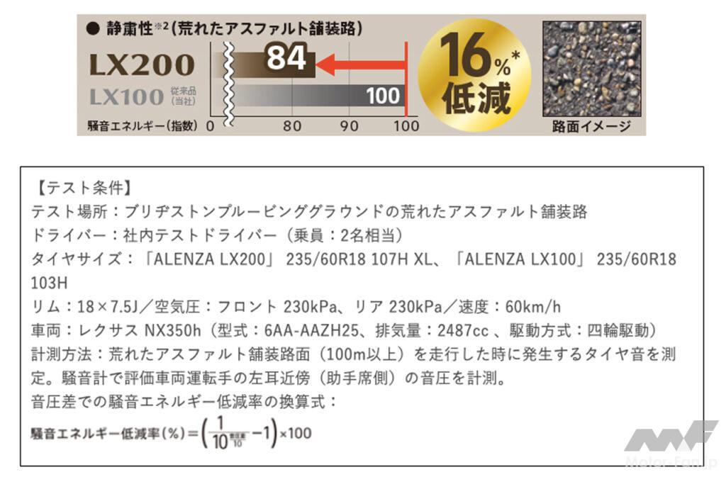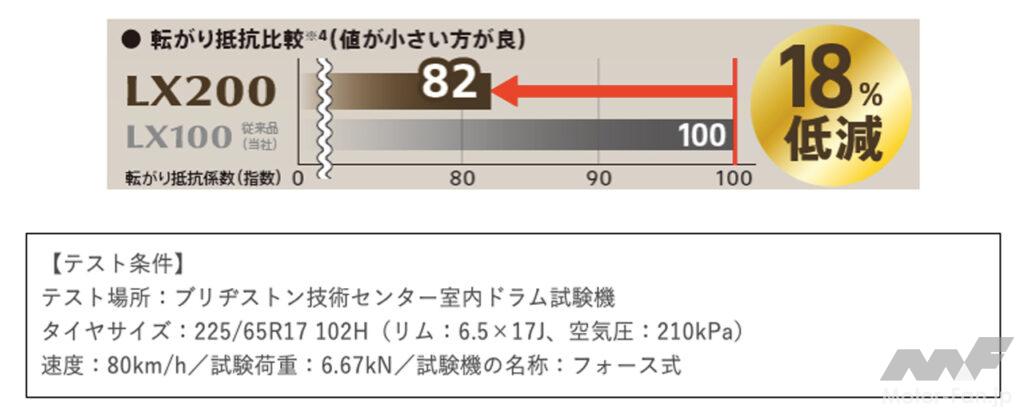 従来品「アレンザLX100」と比べて静粛性で16%、ウエットブレーキ制動距離で15%、転がり抵抗係数で18%向上