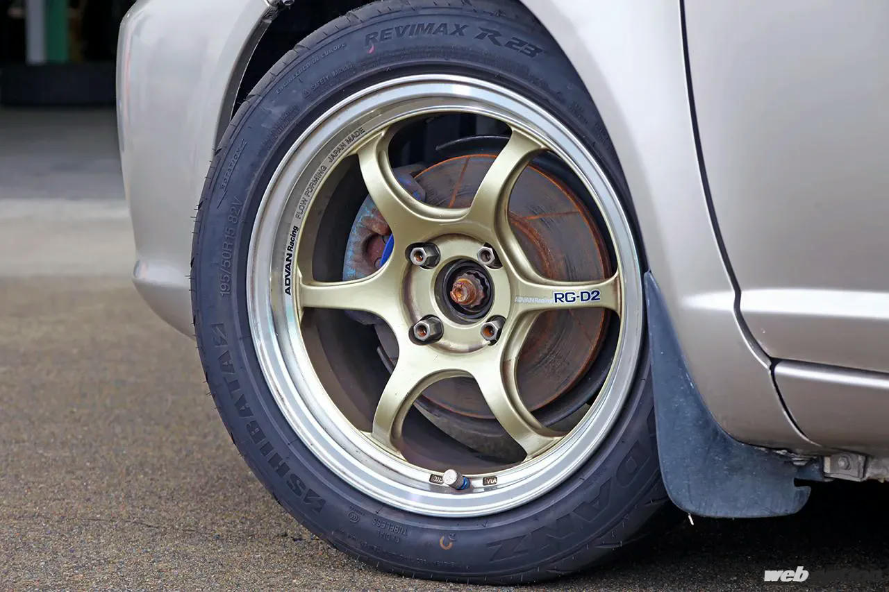 ホイールは15インチのアドバンレーシングRG-D2。リム幅7.0J、オフセット+30で、195/50サイズのシバタイヤレヴィマックスR23が組み合わされる。ボディとのマッチングを図るため、ホイールカラーはシャンパンゴールドを選択。