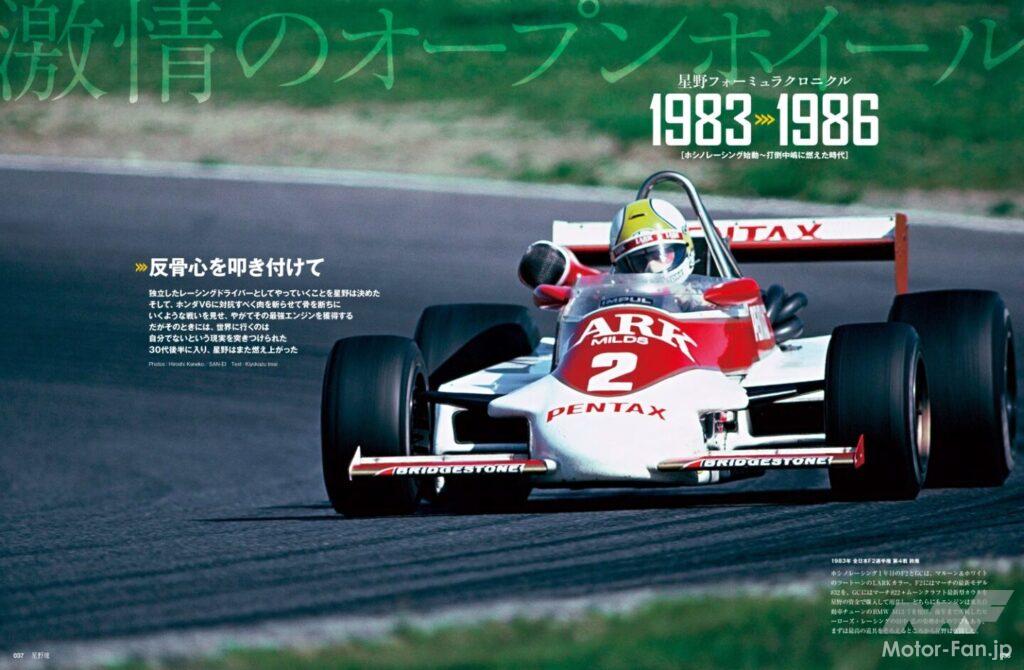 星野が最も情熱を傾けたフォーミュラ(グラチャン含む)を3つの時代に分けてレースシーンをふり返る。このページの1983-1986年はF2時代。非力なBMW 4気筒エンジンを限界まで回して、ホンダ製V6エンジンに挑んだ