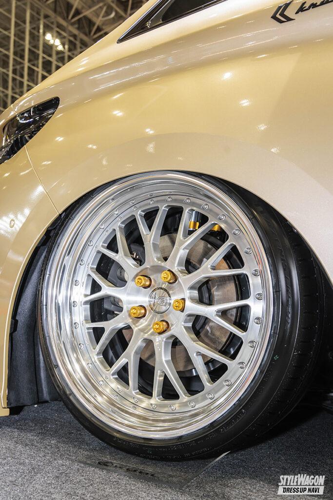 ボンネットスポイラーやフォグカバーガーニッシュも必見。黄金ボディはショー用のラッピングだ。