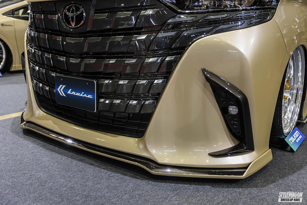 東京オートサロンでお披露目となったクルーズの40アルファードは、薄さ15㎜のスポーティなフラップスタイル。シンプルかつローダウンしやすい造形となるのが魅力で、フロント側面がカナード状となっているなど、薄型ながらもキリッと引き締まった躍動感を手に入れられるのが特徴だ。前方への突出量を控えめにしているため、純正車高でもスタイリッシュにまとまるのもありがたい。