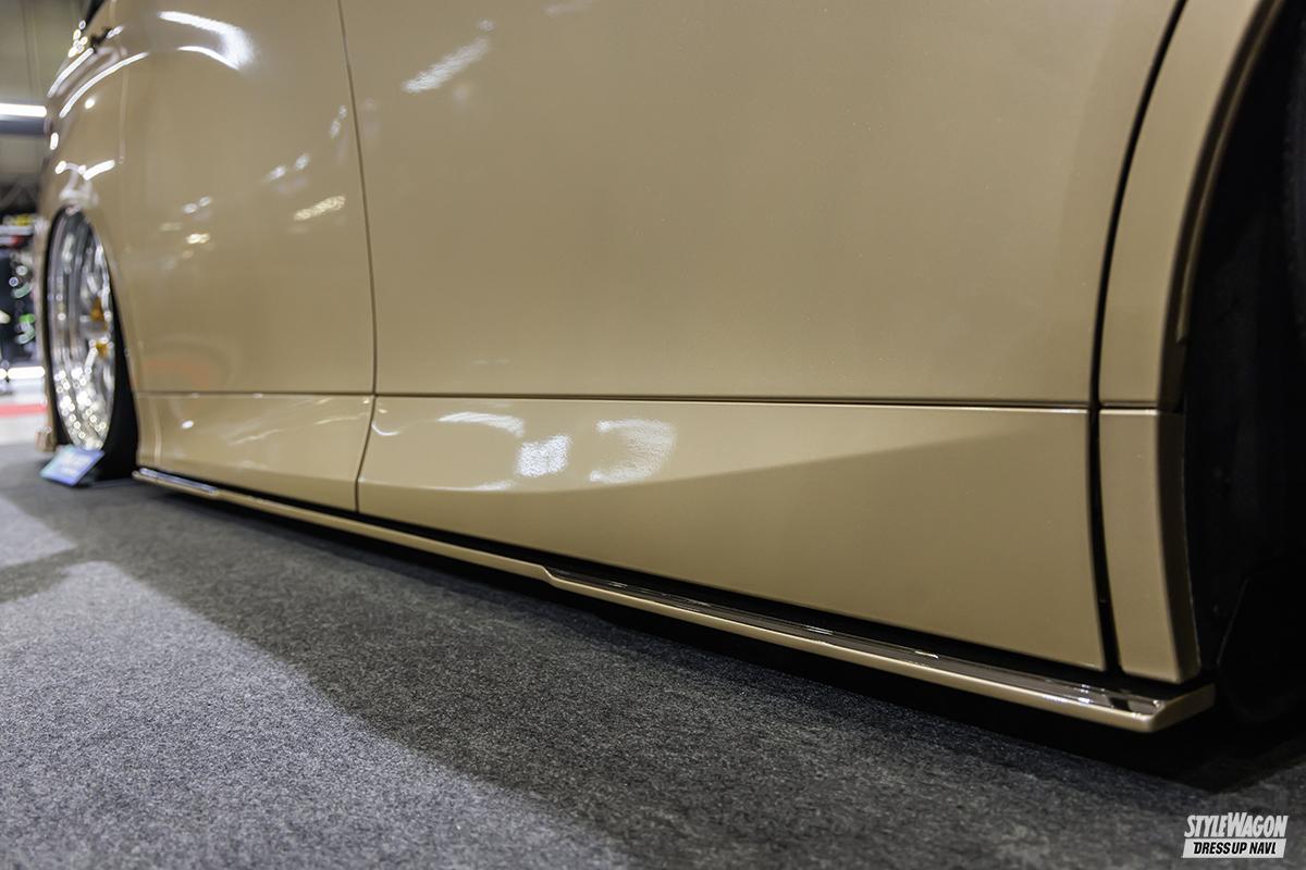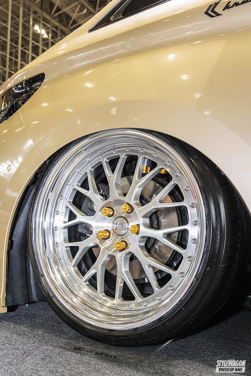 ボンネットスポイラーやフォグカバーガーニッシュも必見。黄金ボディはショー用のラッピングだ。
