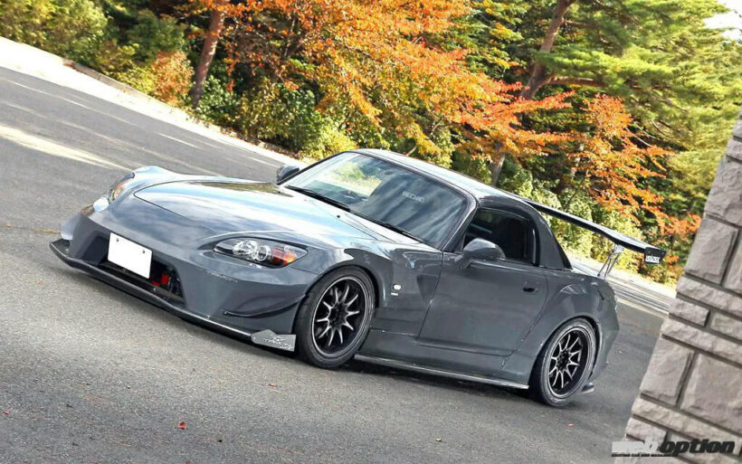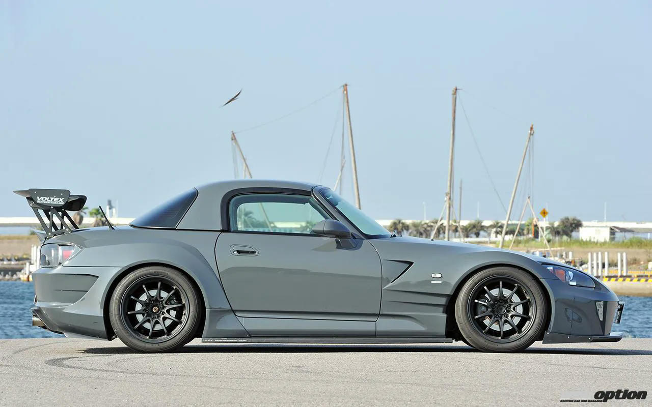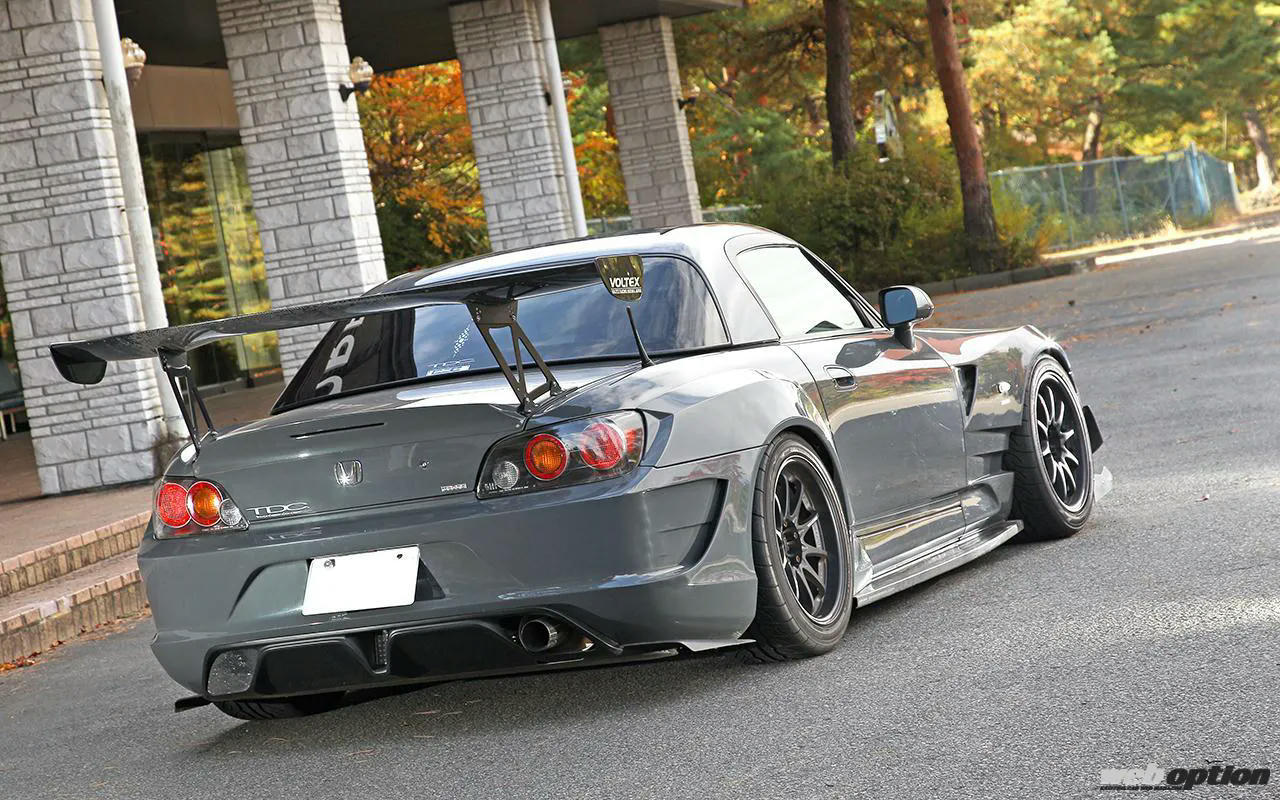 フロントはS2000特有のロングノーズをさらに50mmほど延長し、3D形状のアンダースウィープをインストール。空力を追求しながら、曲面を活かしてスポーティさに磨きをかけている。