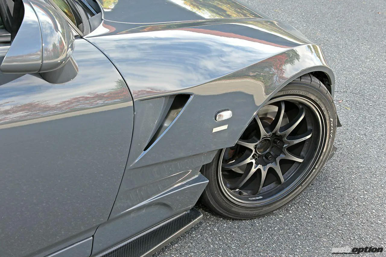 フェンダーはフロント片側30mm、リヤ片側40mmのワイド仕様となる。曲面を逆Rとすることで通常のオーバーフェンダーではあり得ないエッジ感を演出しているのは、さすがタモンデザインだ。ホイールはボルクレーシングCE28Nで、サイズはフロント9.5J+40、リヤ9.5J+22。タイヤにはアドバンネオバAD08の255/40-17サイズを選択する。