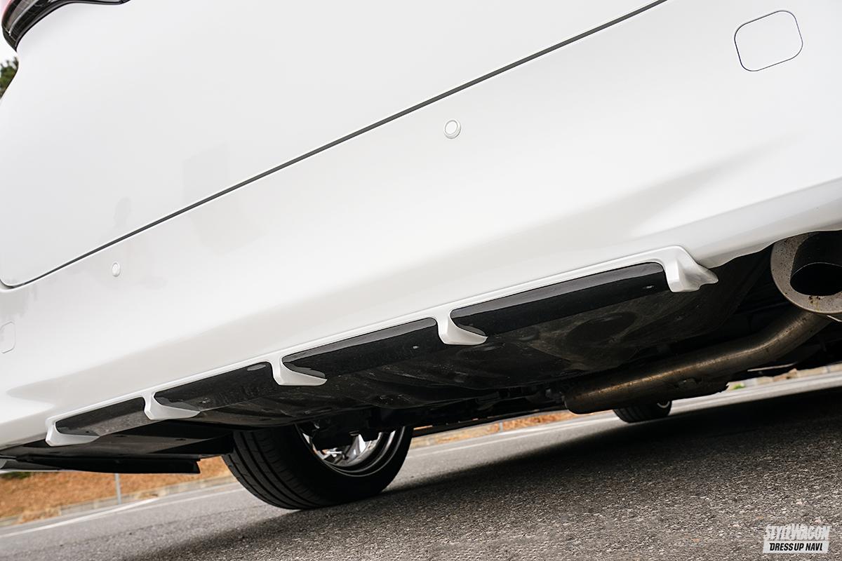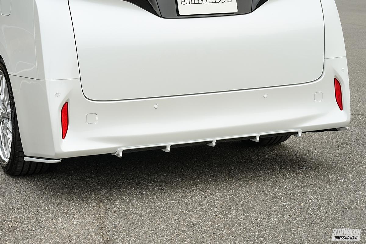 フロント、サイド、リアの3パートで設定されるエアロは、純正フォルムを崩さないナチュラルな仕上がりを狙った薄型フラップタイプ。フロントとリアはセンターと両サイドの3分割式設定となり、フロントは取り付け位置の変更で出幅の調整も可能としているのがポイント。リアセンターには5つの縦フィンを盛り込んだディフューザーとすることでスポーティな躍動感を演出。