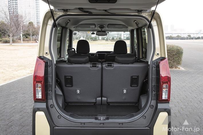 特に荷室では、タントシリーズに共通する樹脂製デッキボードに加えて、後席シートバックにも防水生地が使われる。また、後席用USBソケット(後席可倒時は荷室で使える)やラゲッジルームランプも追加されて、キャンプや釣りのような使い方を想定しているのがファンクロスならではの特徴だ。