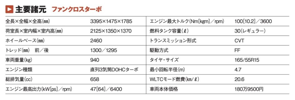 このように荷室などに幾ばくかの専用機能が追加されるファンクロスだが、その他は良くも悪くも、コスメチューンの域にとどまるのはスペーシアギアと変わりない。150㎜(4WDは165㎜)という最低地上高も通常のタントのそれと寸分たがわず、ターボで15インチ、自然吸気で14インチのタイヤも、サイズ・銘柄ともにファンクロスだからと特別なものではない。