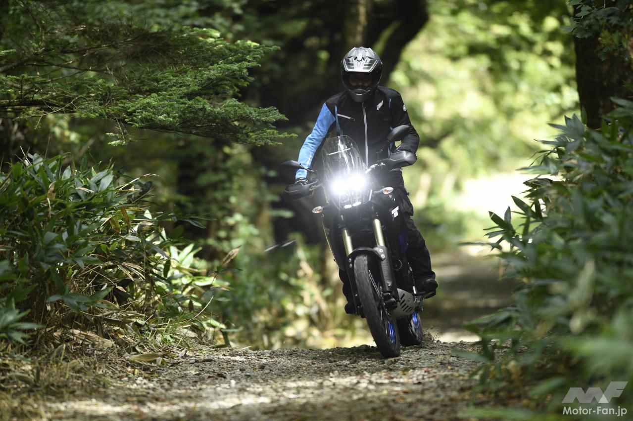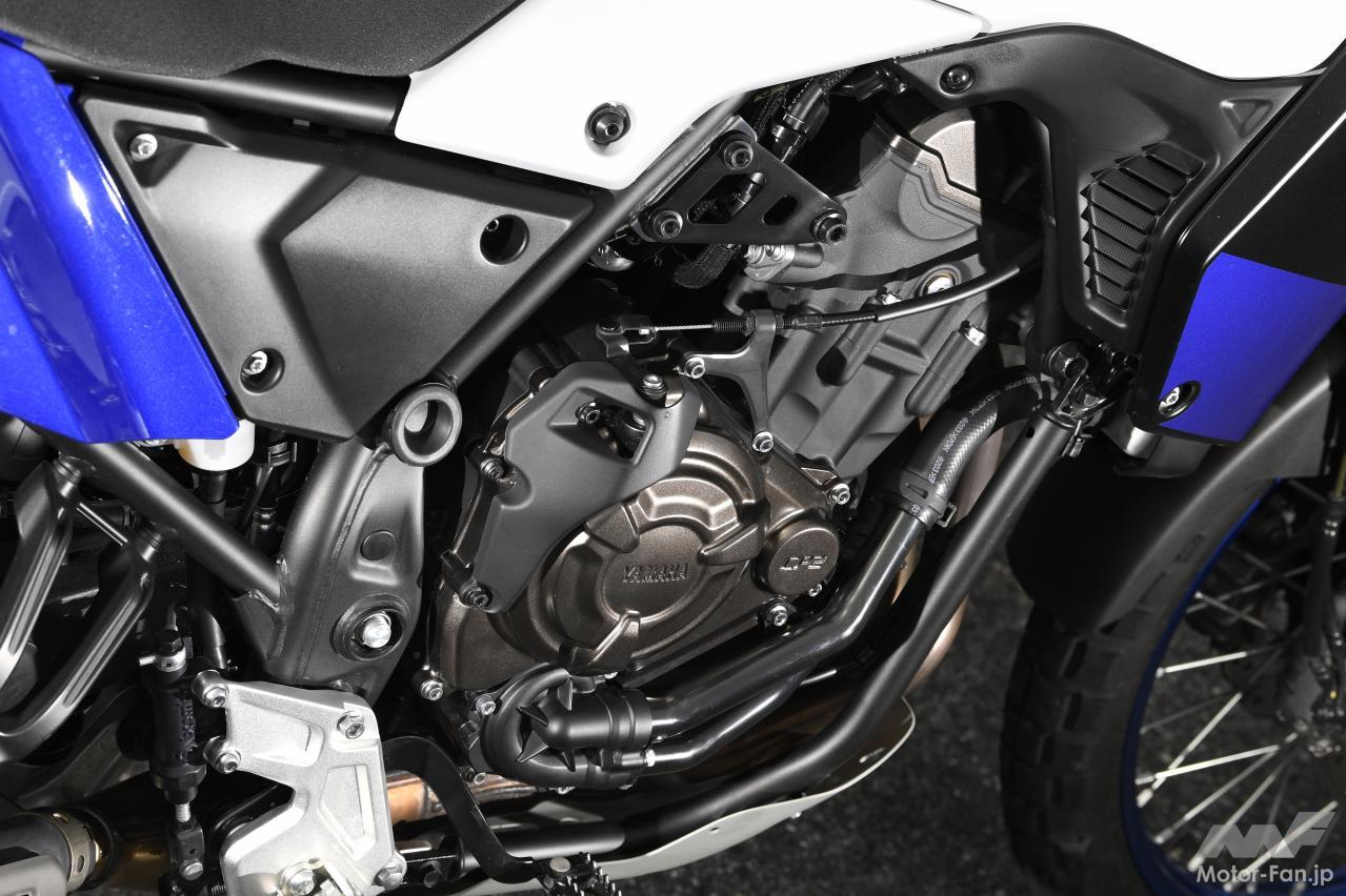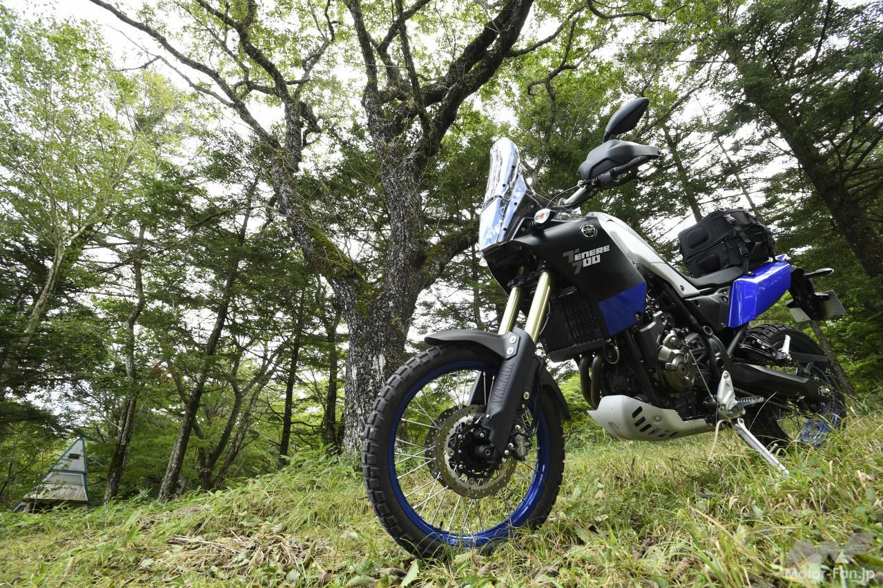 僕がテネレ700で特に感心したのは以下の3点。まず1つ目は、270度クランクの並列2気筒が発生するトラクションの濃厚さ。もっとも、同じエンジンを搭載する既存のMT-07やXSR700だって、トラクションはわかりやすかったのだけれど、車体と吸排気系を専用設計したテネレ700は、さらに3割増し?と言いたくなる印象で、舗装路ではリアのグリップ力、未舗装路ではリアのスライドを、自在にコントロールしている感触が味わえる。