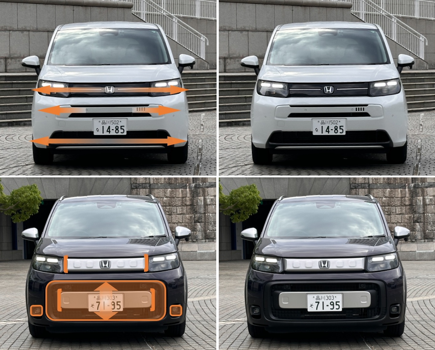 エアは全幅と全高がほぼ同寸のスクエアな正面視において、可能な限り左右方向の要素を用いることで、横方向の幅を実寸以上に意識させたり、水平安定感を感じさせるように仕向けている。グリル+ヘッドライトが高い位置にあることも重要だ。このおかげでフロントに厚み感がでて、頼りがいや安心感を感じさせることにつながる。