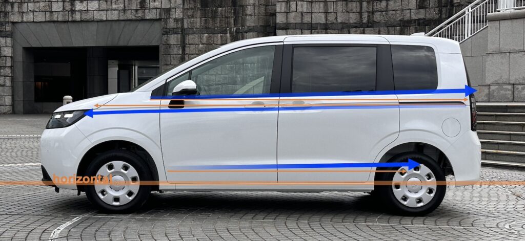 オレンジ線は全て水平。ブルー線はそれを示すキャラクターラインのウェッジ角度。水平基調に見せるためには水平線は使えない。わずかにウェッジ角度をつけることで水平印象だが動きを感じることができる。