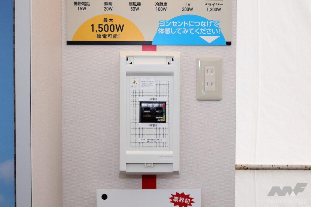 これは、HEV、PEHV、FCEV、BEVなど大容量バッテリーを持つクルマで100V・1500W/非常時給電システム付きコンセント、または100V・1500W/ヴィークルパワーコネクターを搭載しているクルマから家庭に電力を供給するシステムだ。