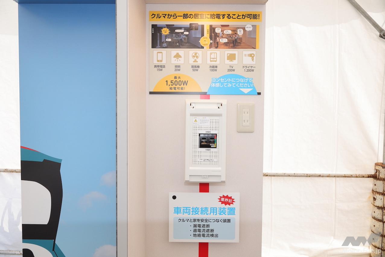 これは、HEV、PEHV、FCEV、BEVなど大容量バッテリーを持つクルマで100V・1500W/非常時給電システム付きコンセント、または100V・1500W/ヴィークルパワーコネクターを搭載しているクルマから家庭に電力を供給するシステムだ。