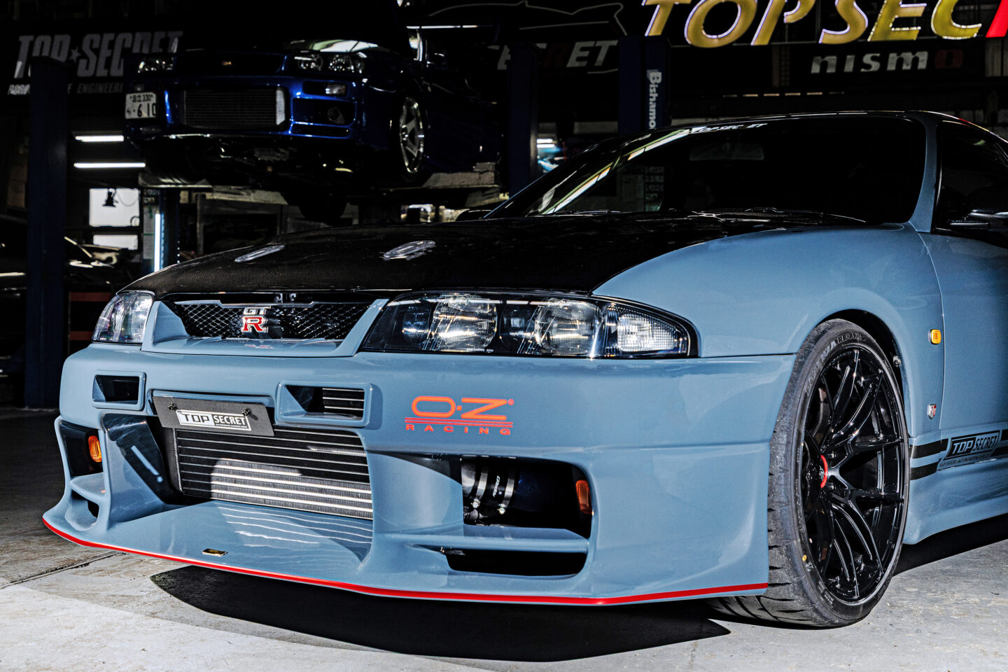 ホイールは、OZレーシングとのコラボレーションで誕生した最新作『OZ TOPSECRETエストレマ フォージアータ(19×10.5J+15)』。ブレーキはBNR34のブレンボキャリパーを前後に奢り、オーバー500psに見合ったストッピングパワーを手にしている。