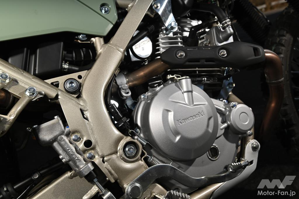 ところが新しいKLX230シェルパは、アクセルをワイドオープンして飛ばしたときの走破性をしっかり維持しながらも、低回転低速域がムチャクチャ優しくて従順になっているのだ。誤解を恐れずに表現するなら、SL230やヤマハ・セローなどのように、林道では景色を眺めながらのトコトコ走行が堪能できるし、市街地はミズスマシのようにスイスイ走れる。そういった事実を考えると、第二世代のKLX230シリーズの守備範囲は、初代と比較すると格段に広がったと言っていいと思う。