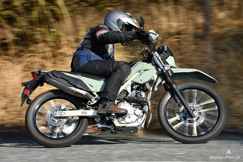 などということを考えていた僕が、未舗装路を含めたさまざまな場面を走って、“次の愛車はコレか?”と感じたのが、カワサキが2024年末から発売を開始したKLX230シェルパ(134kg・1365mm)である。もっともこのモデルには基本設計を共有するKLX230Sが存在し、2台の乗り味にはほとんど差異が無いようだから、おそらくKLX230Sに乗っても、僕は同様の印象を抱いただろう。