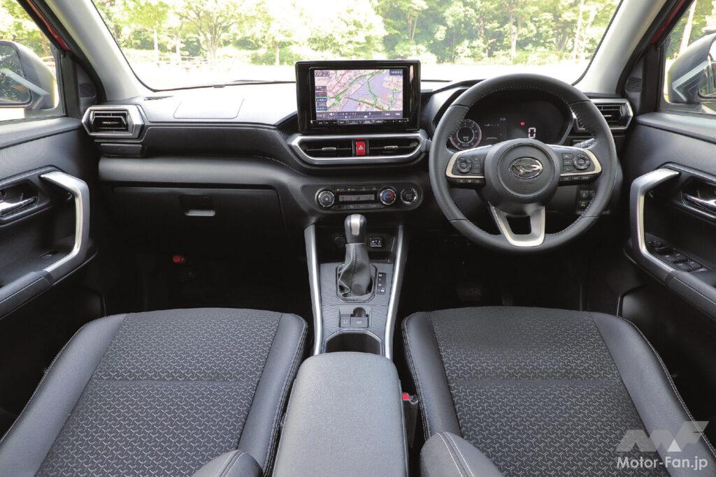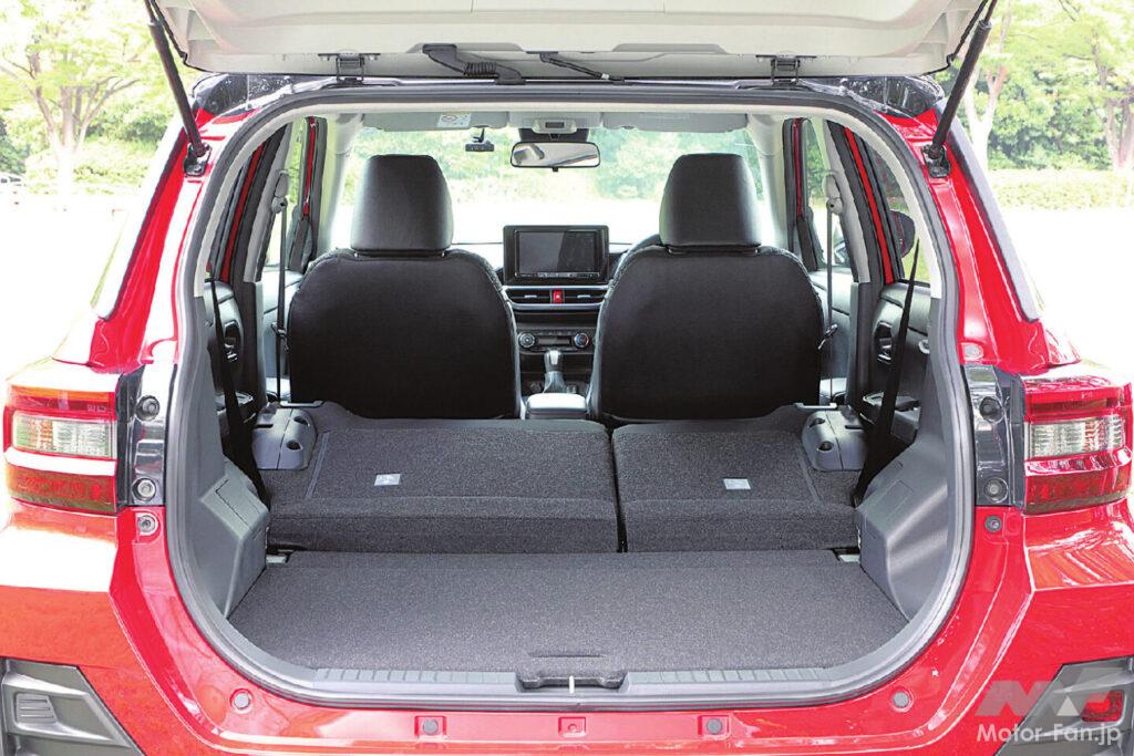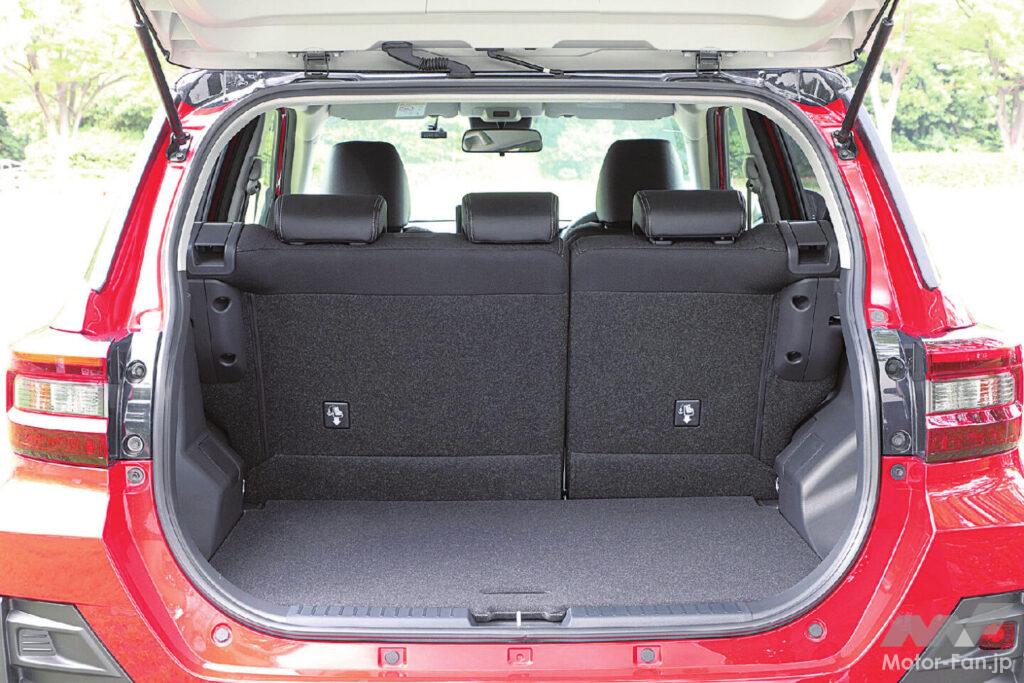 全長は4mを切るコンパクトサイズで、最小回転半径は4.9〜5.0mと、小回り性は抜群だ。加えてフェリー料金も安いから、ドライブルートの選択肢も増える。コンパクトな外観にも関わらず、室内が広いのもロッキーの特長。身長181㎝の著者が運転席を合わせ、そのまま後席に移動しても、膝の前には手のひらの厚いところが入るくらいの余裕がある。ラゲッジは床下にも収納スペースがあり、容量はパワートレインによって異なるが、ガソリンFF車ならプラス80ℓのエクストラスペースが用意される。