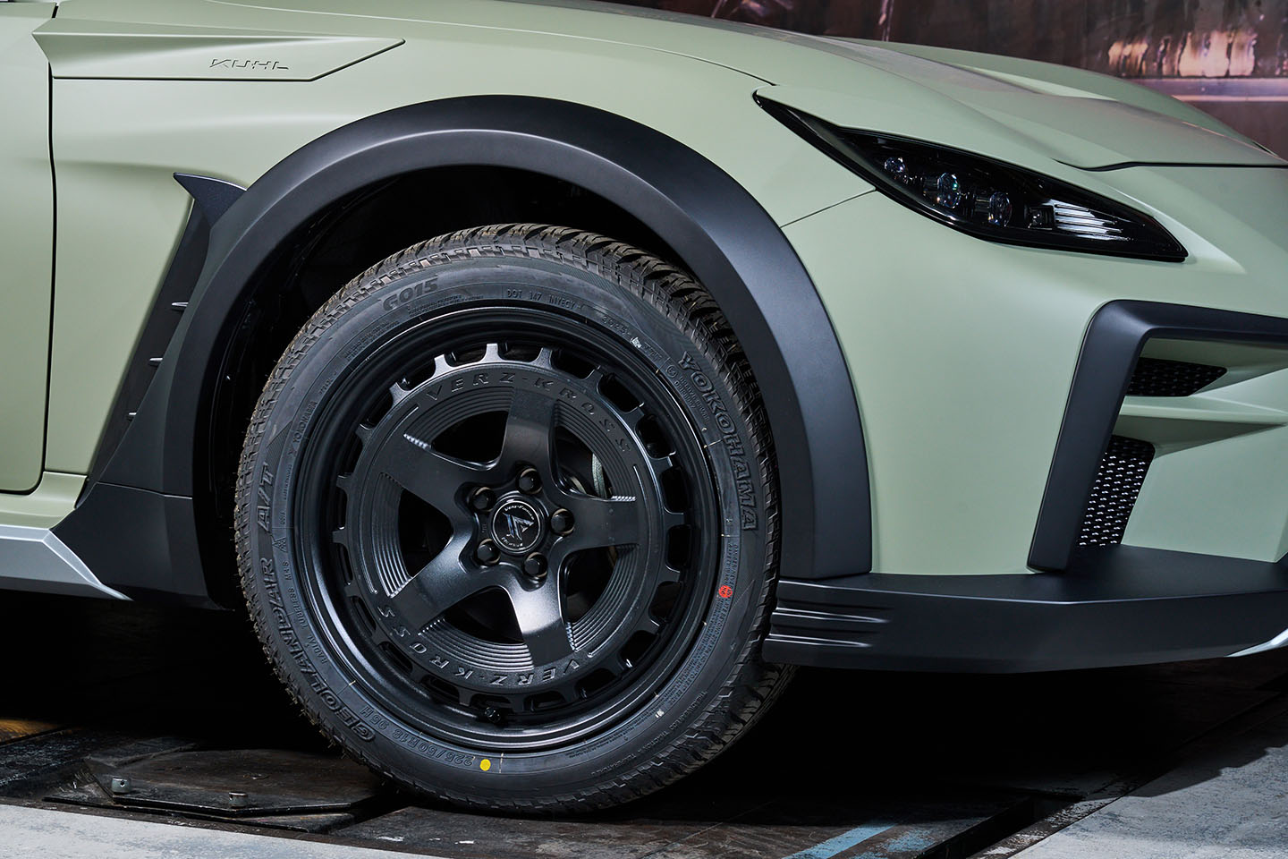 ホイールはZN8ナローボディ向けに設定された18インチ8.5J+30のヴェルズフォージド・ネクサスNEX02を装着し、オーバーフェンダー分として15mmスペーサーを追加。ステアリング操作時の干渉を防ぐため、タイヤは225/50R18サイズのジオランダーA/Tを組み合わせている。なお、東京オートサロン会場ではオリジナルブレーキをアピールするため、19インチの8スポークホイールを装着する予定だ。