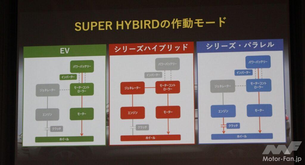 スーパーハイブリッドの走行モードは、メインとするEV、ガソリンエンジンを発電にだけ使うシリーズハイブリッド、モーター走行に加えて、エンジンをクラッチで直接つなぐシリーズ・パラレルの3モードになる。