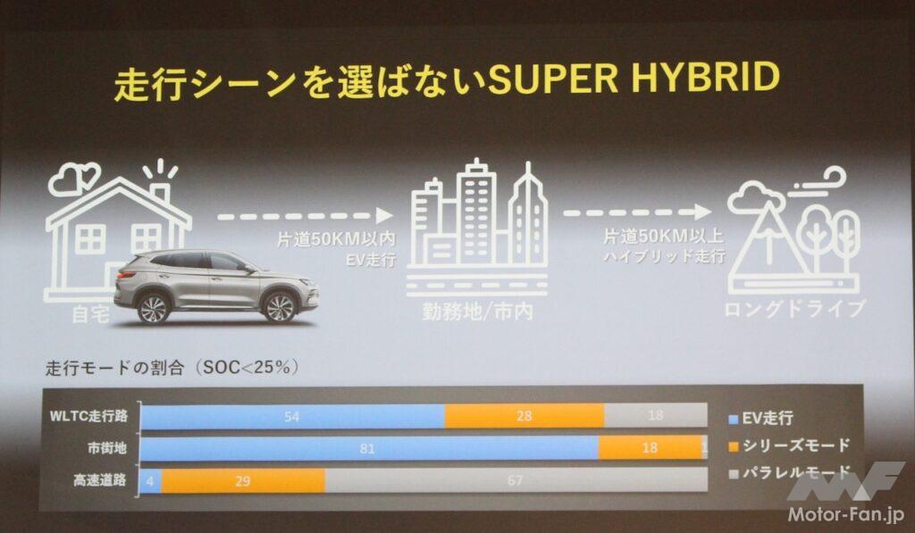 BYDのプラグインハイブリッドは、グローバル累計販売は740万台を超え、90以上の国や地域に投入しているという。商品企画の新道氏は、スーパーハイブリッドがスーパーであるゆえんについて、「高効率ガソリンエンジンとBYD独自のハイブリッドシステムによる圧倒的な低燃費」、「モーター走行を主軸とした電動走行による静粛性」、「電動走行による優れたパフォーマンス」を挙げている。