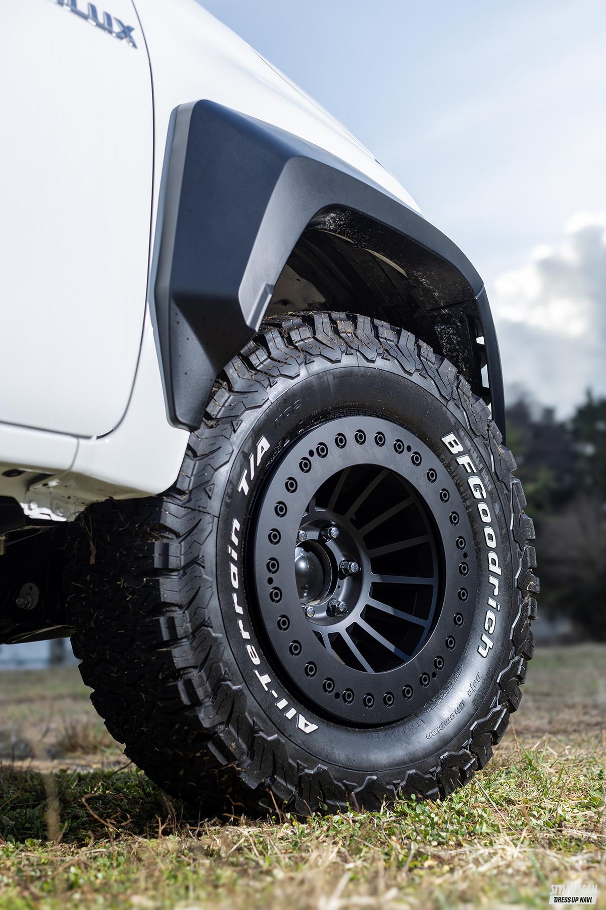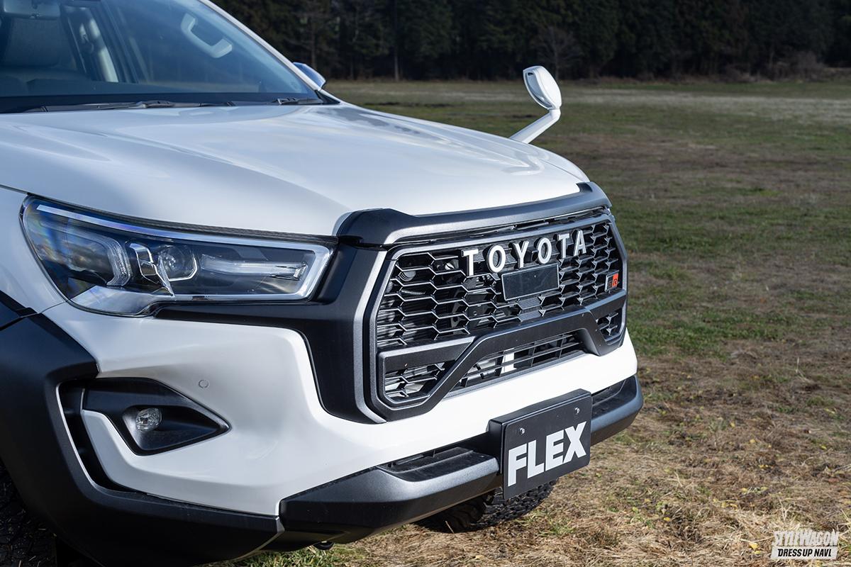 そんなピックアップトラックでのオーバーランドスタイルを実践したのが、フレックスが仕立てたハイラックスだ。まず目を引くのが、オーバーランド大国ニュージーランドやオーストラリアのハイラックスに設定されるGRスポーツ用バンパー&オーバーフェンダー。そこにビードロックを採用したガチオフ系ホイールを組み合わせ、オーバーランドが似合うワイルドなルックスに仕立てられている。
