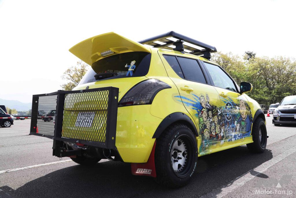 会場の中でもひと際目立っていた黄色いのっぽのスイフトスポーツは、オーナーの「あも」さんが6年間乗り続けているもの。元々はモンスタースポーツのコンプリートカーVer.3だったそうで、車高短ばかりなのであえてリフトアップのスタイルに仕上げたのだとか。