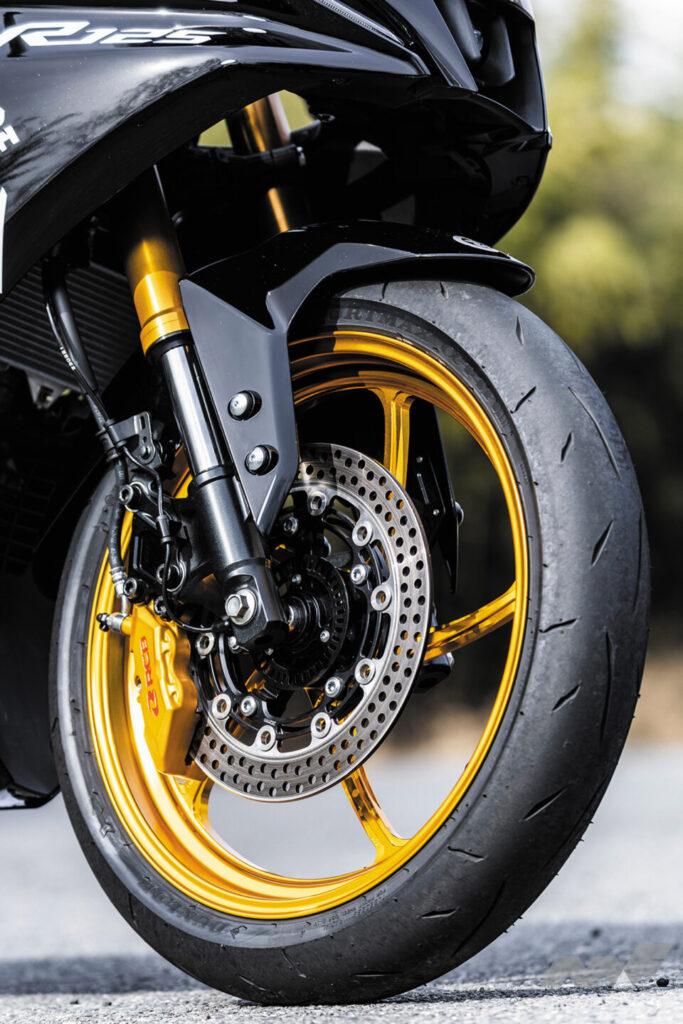 深くローレットが刻まれた剛性感のあるステップによって倒し込みの入力もしやすく、MOSの軽量鍛造ホイールが空気のような軽さでコーナーへとマシンを放り込んでいく。コーナリングでの圧倒的な安心感はやはりラジアルタイヤの恩恵だろう。ダンロップ製α14タイヤのフロントの接地感は絶大で進入時のブレーキコントロールもしやすく、ワンサイズ太くなったリヤタイヤとRCB製リヤショックのしなやかな剛性感が立ち上がり加速でのトルクをしっかりと受け止めてくれた。