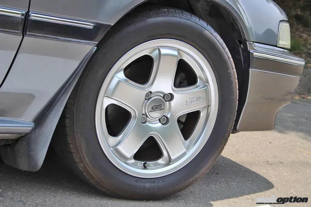 ホイールはシンプルで力強いデザインの無限M5で、純正1インチアップとなる15インチに交換。そこに195/55R15サイズのネクストリーが組み合わされる。