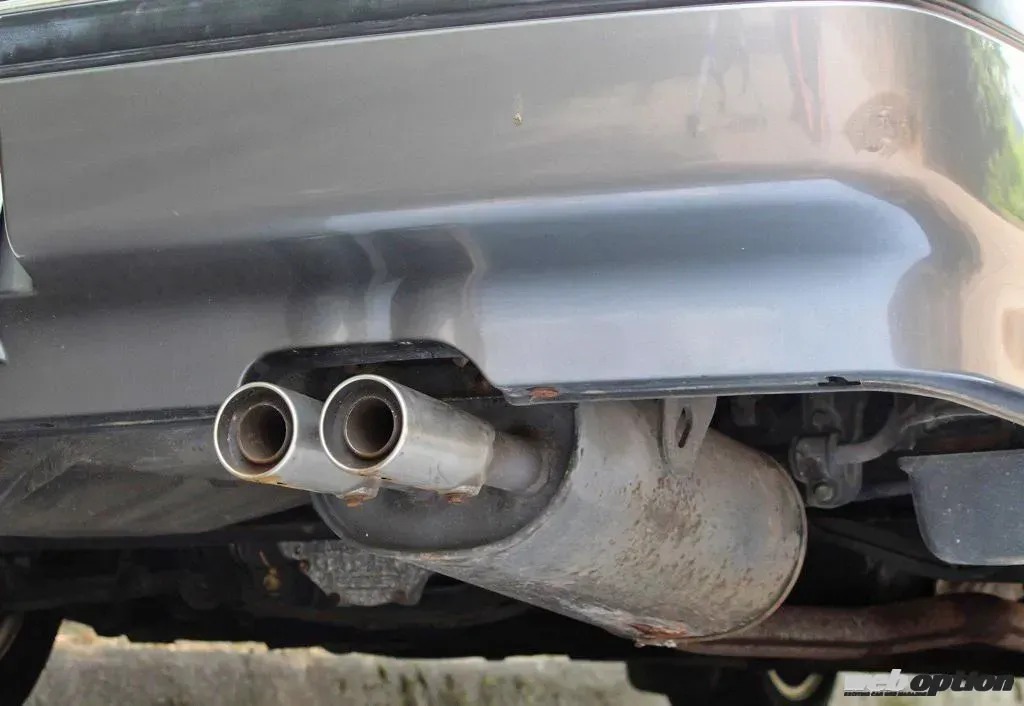 マフラーは純正デュアル出し。メインサイレンサーの奥にデフキャリアっぽくチラリと見えるのが、後輪をステアさせるためのギヤボックス。4WSはステアリング舵角が小さい時は後輪を同位相(前輪と同じ向き)に、舵角が一定以上に大きくなると逆位相(前輪と逆の向き)にステアさせる。それをメカニカルに行なっているのが変態極まりない。