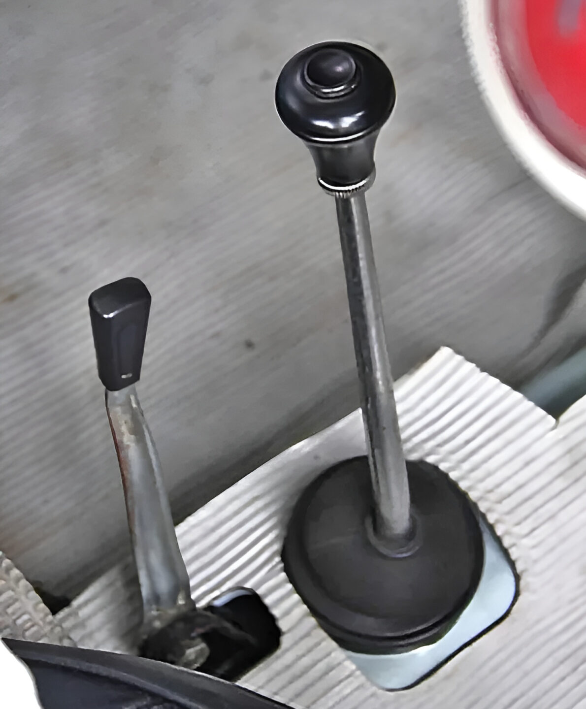 前方がATセレクターレバー。グリップ上部に設けられたボタンはリバース切り替え用だ。