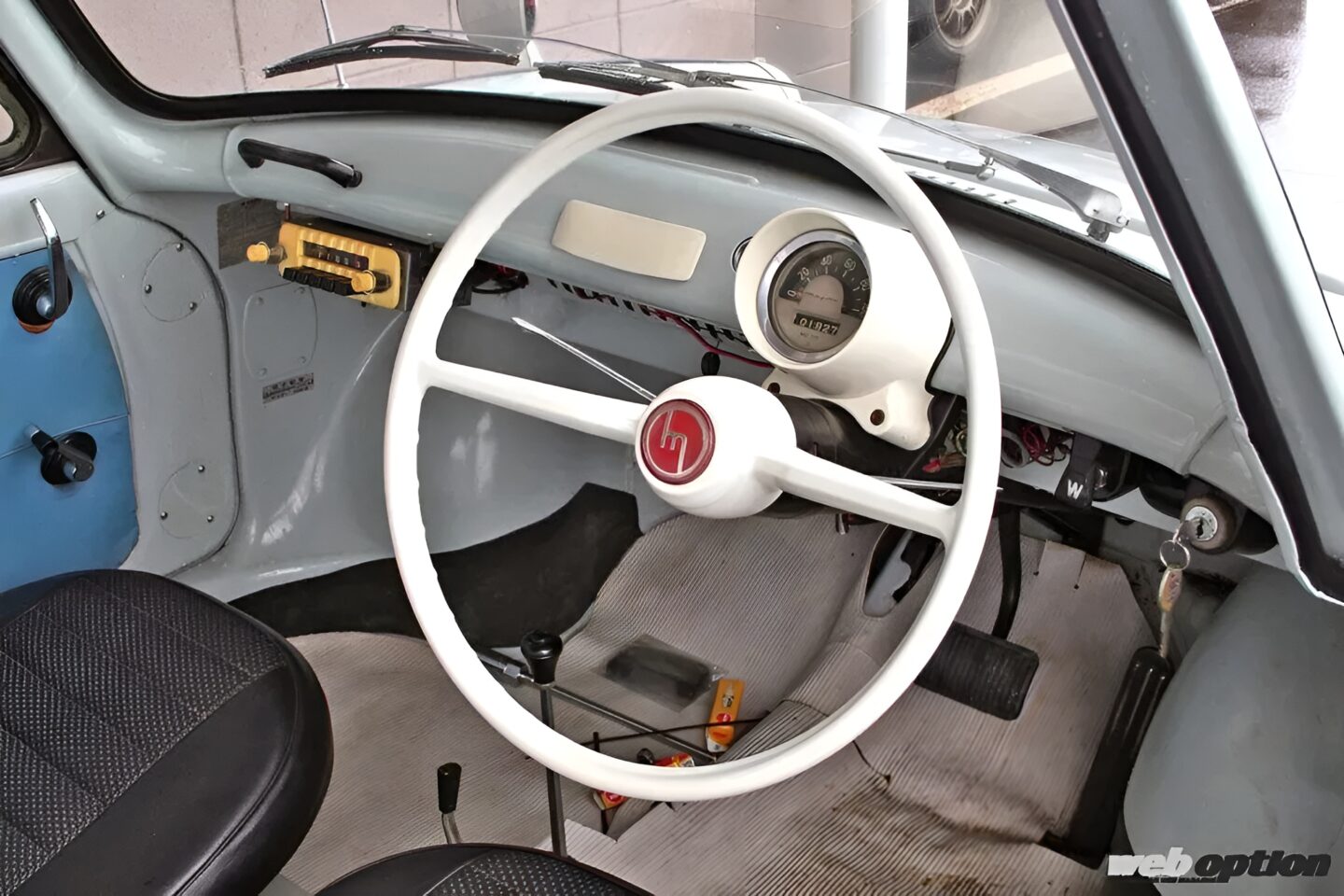 鉄板剥き出しのダッシュボードに速度計が装着された何ともシンプルなインテリアだが、細身で繊細なデザインのステアリングとウインカーレバーがアートを感じさせる。