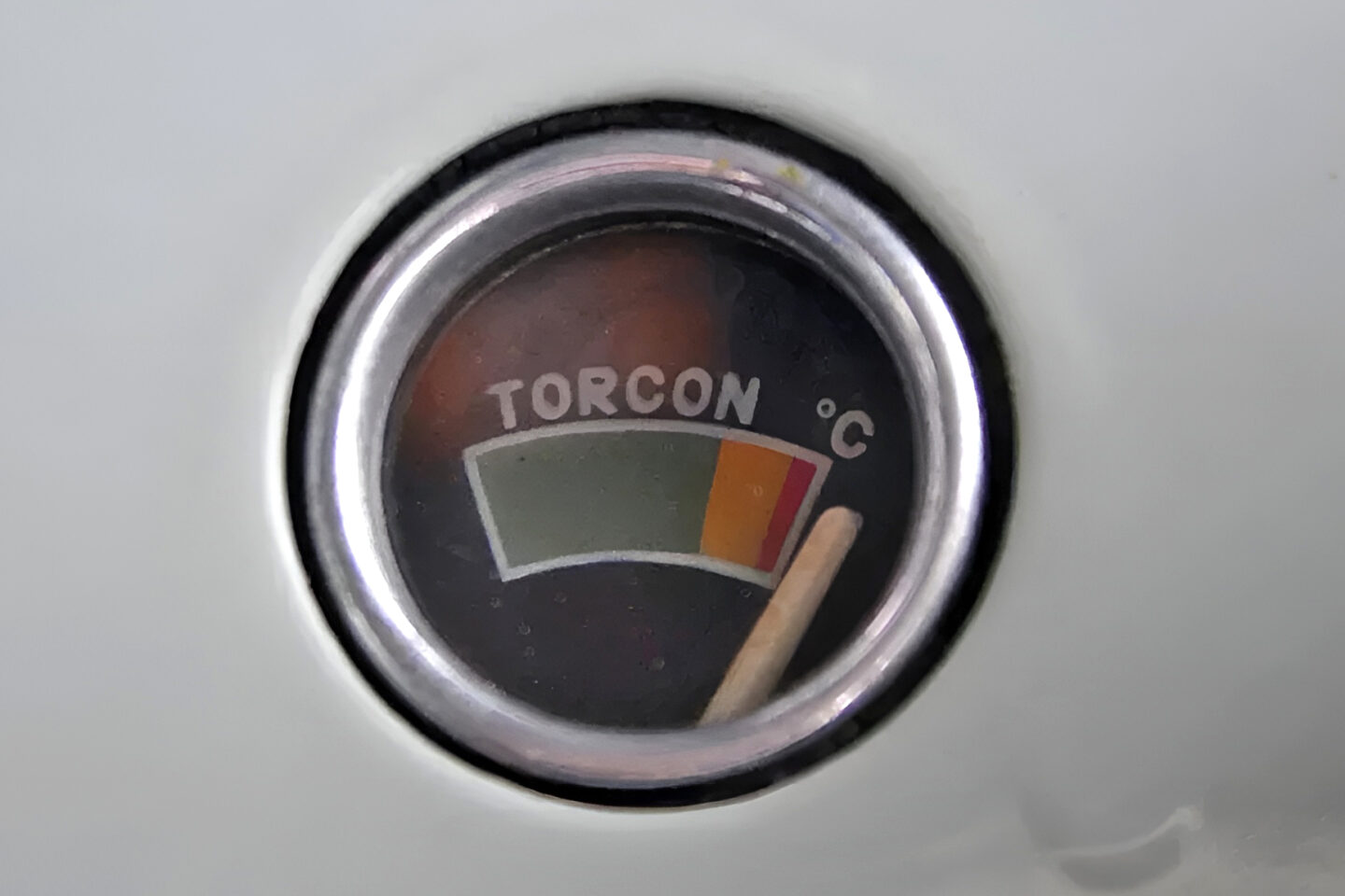 ダッシュパネルのほぼ中央に装着された小さなメーターは、何とトルコン油温計。2速ATモデルには標準装備されていた。