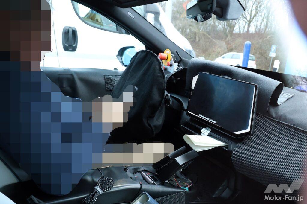 初めて撮影に成功したキャビン内は、ノイエクラッセがインテリアにも引き継がれ、パノラミックiDriveが装備されている。フロントウィンドウ下部にはピラー・トゥ・ピラー・ディスプレイと、おそらく17.9インチと思われる独立型インフォテインメントシステムが搭載されている。