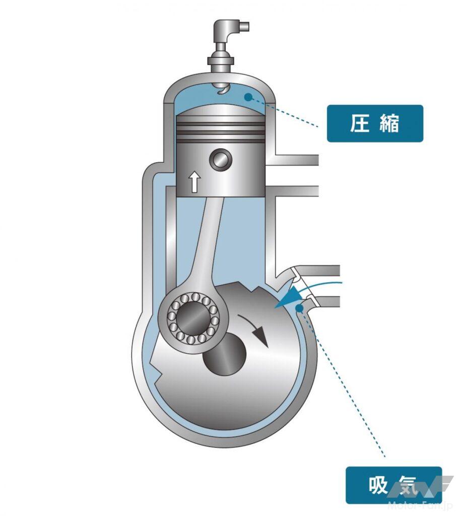 本図は「クランクケースリードバルブ式」と呼ばれる方式で、ほかにもシリンダーに吸気ポートを直接設ける「ピストンバルブ式」、クランクに一部切り欠きを設けてその間を吸気工程とする「ロータリーバルブ式」などがある。