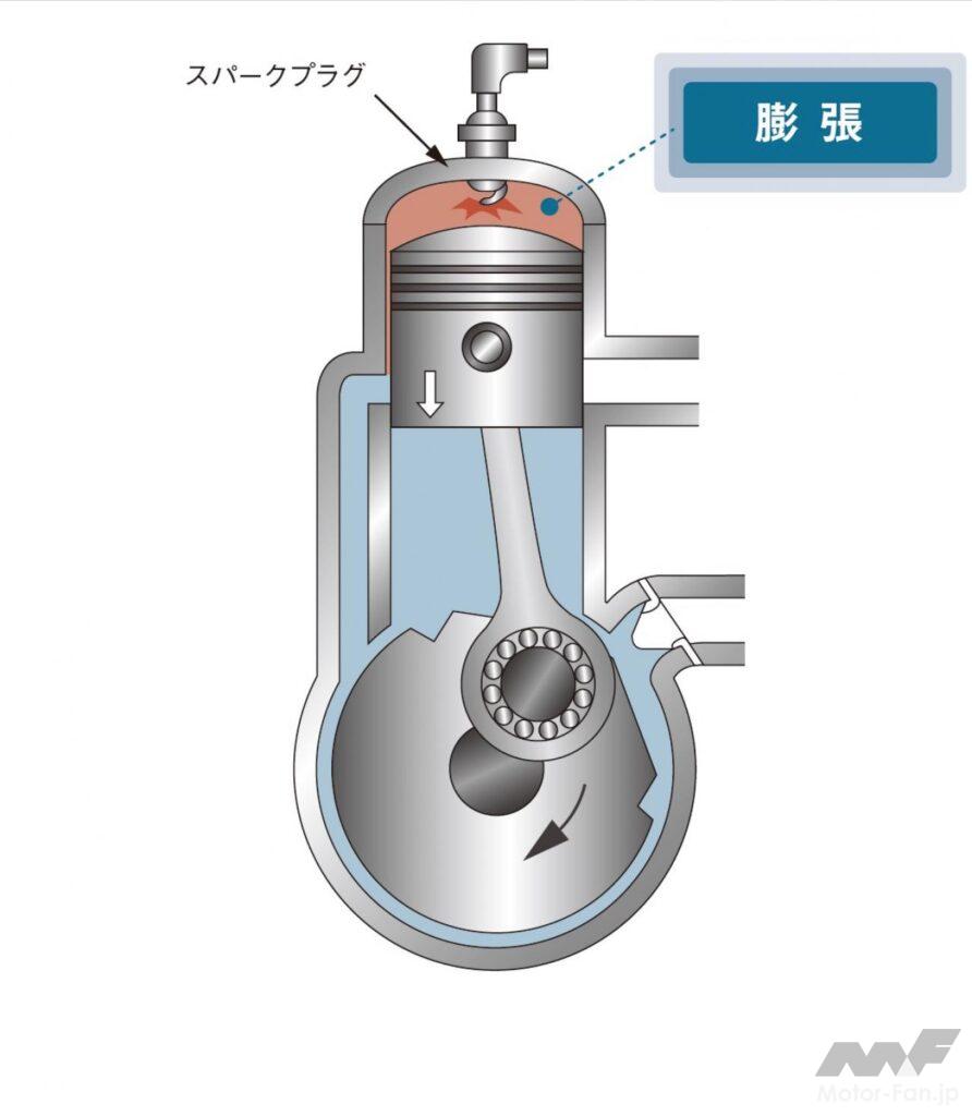 上死点を過ぎピストンが下降し始めたところ。上死点付近でスパークプラグで着火、膨張行程を得るのは4Tエンジンと同様。そのとき腰下では、すでにリードバルブが閉じて混合気で満たされているクランクケース内で圧縮が始まっている。当然、掃気ポートも排気ポートも閉じていなければならない。