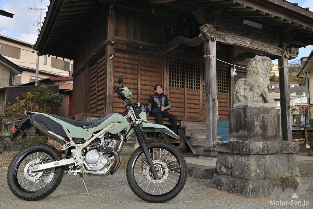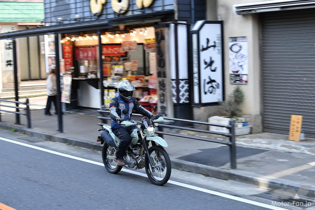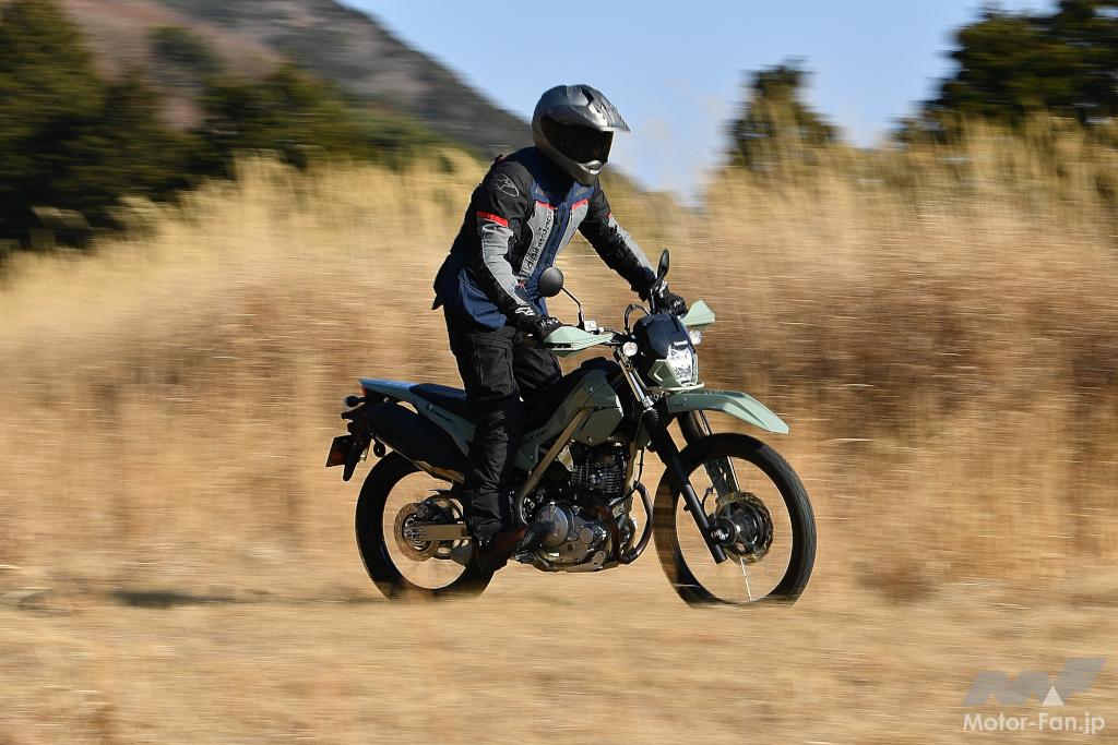 車体の話が長くなったけれど、今回の試乗ではパワーユニットにも大いに感心。同時期に開発された同系エンジン搭載車のW230/メグロS1が、低回転の味わいを重視した特性を構築しているためか、KLX230シリーズは高回転指向と言われているようで、確かにシェルパに乗った僕は、中回転域からの伸びがW230/メグロS1よりシャープで力強いことを認識したのだが……。