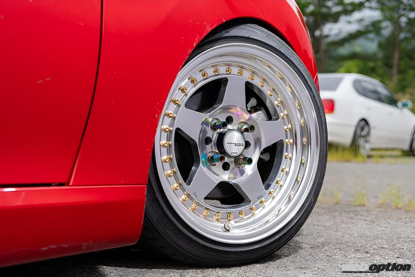 オーナーのカスタム意欲は、顔面スワップだけには留まらない。「現行コペンでシャコタンって珍しいんですよ!」との理由から、ギリギリのツライチセッティングを追求。フロントに7.5J、リヤに8.5JのワークCR01をセット。シュピーゲルの車高調に、J-LINEのリヤアクスルキット(ネガキャン8度)などを組み合わせてロースタイルを構築している。