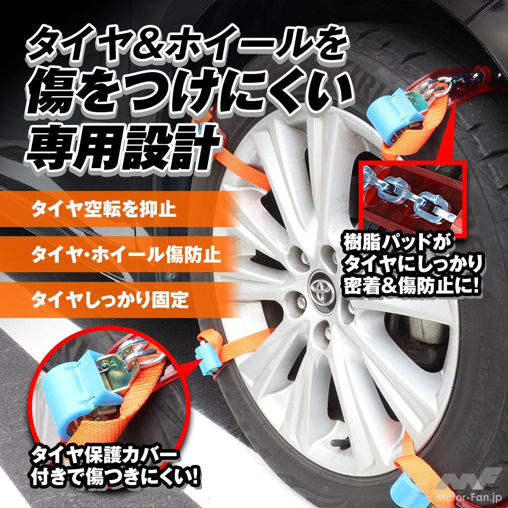 MAXWINからリリースされた、樹脂パッド付金属製タイヤチェーン『K-TIR08』は、車両が雪道でスタックした場合などの緊急脱出用におすすめのアイテム。一般的なチェーンのようにタイヤ全体を覆うように装着するのではなく、タイヤの3カ所または4か所に巻き付けるように装着するセパレート型のため素早く簡単な取付作業が可能だ。ジャッキアップ作業も不要なのがうれしい。