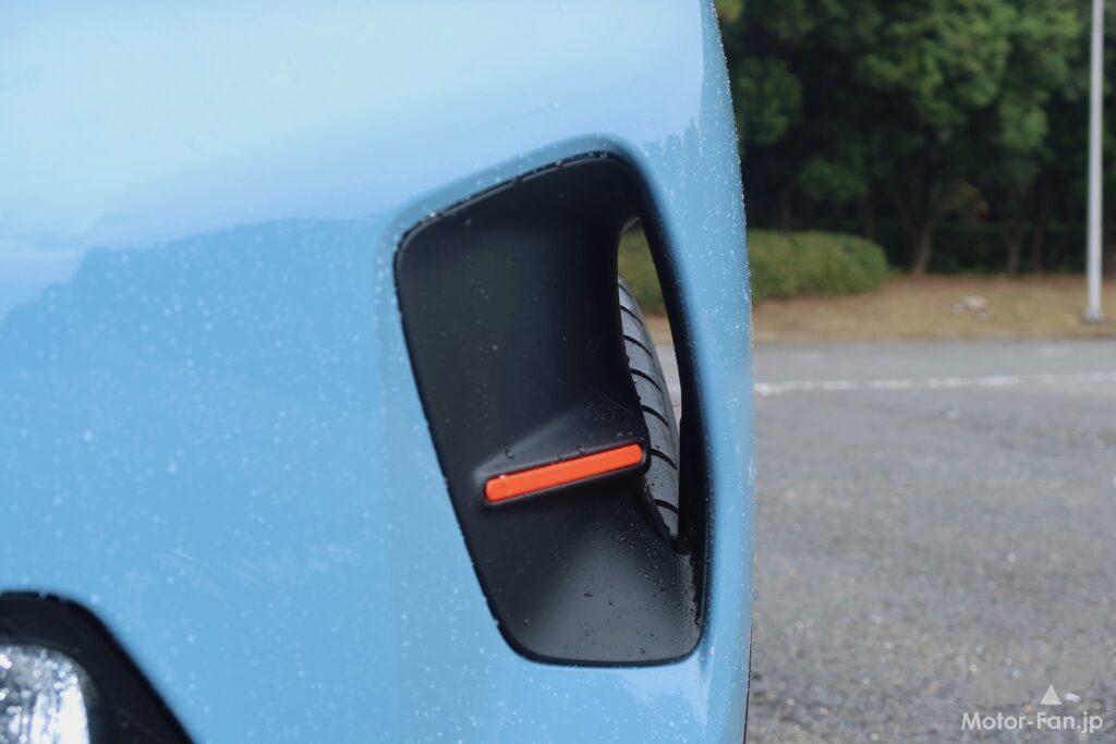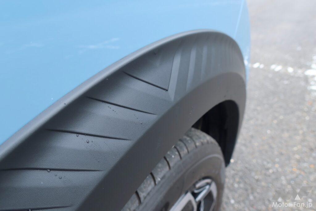 エンブレムの左右に延びる樹脂の装飾にもシェブロンを反復。SUVライクなたくましさを表現するブラックの樹脂製のホイールアーチにもシェブロンをあしらっている。フロントバンパーのコーナー部やリヤクォーターには、アクセントとしてカラークリップを配している。また、フロントバンパー下部のスキッドプレート風パーツやリヤバンパー下部のパーツは塗装ではなく、樹脂材料にあらかじめ着色して成形する原着樹脂を採用。見た目に新規性があるし、傷つき性に優れている(塗装のように剥げない)のがメリットだ。
