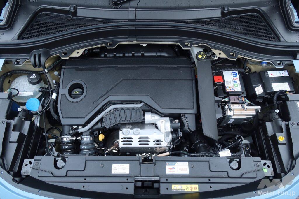 エンジンはガソリン1.2L直列3気筒ターボ。吸気バルブの閉じタイミングを制御して膨張比>圧縮比を実現するミラーサイクルを適用して効率を高めている。最高出力は74kW/5500rpm、最大トルクは205Nm/1750rpmである。この高効率エンジンに組み合わせるトランスミッションは6速DCT(デュアルクラッチトランスミッション)で、このDCTに最高出力15kW、最大トルク51Nmを発生するモーターを内蔵。助手席下に搭載する48Vバッテリーに蓄える電力で駆動する。